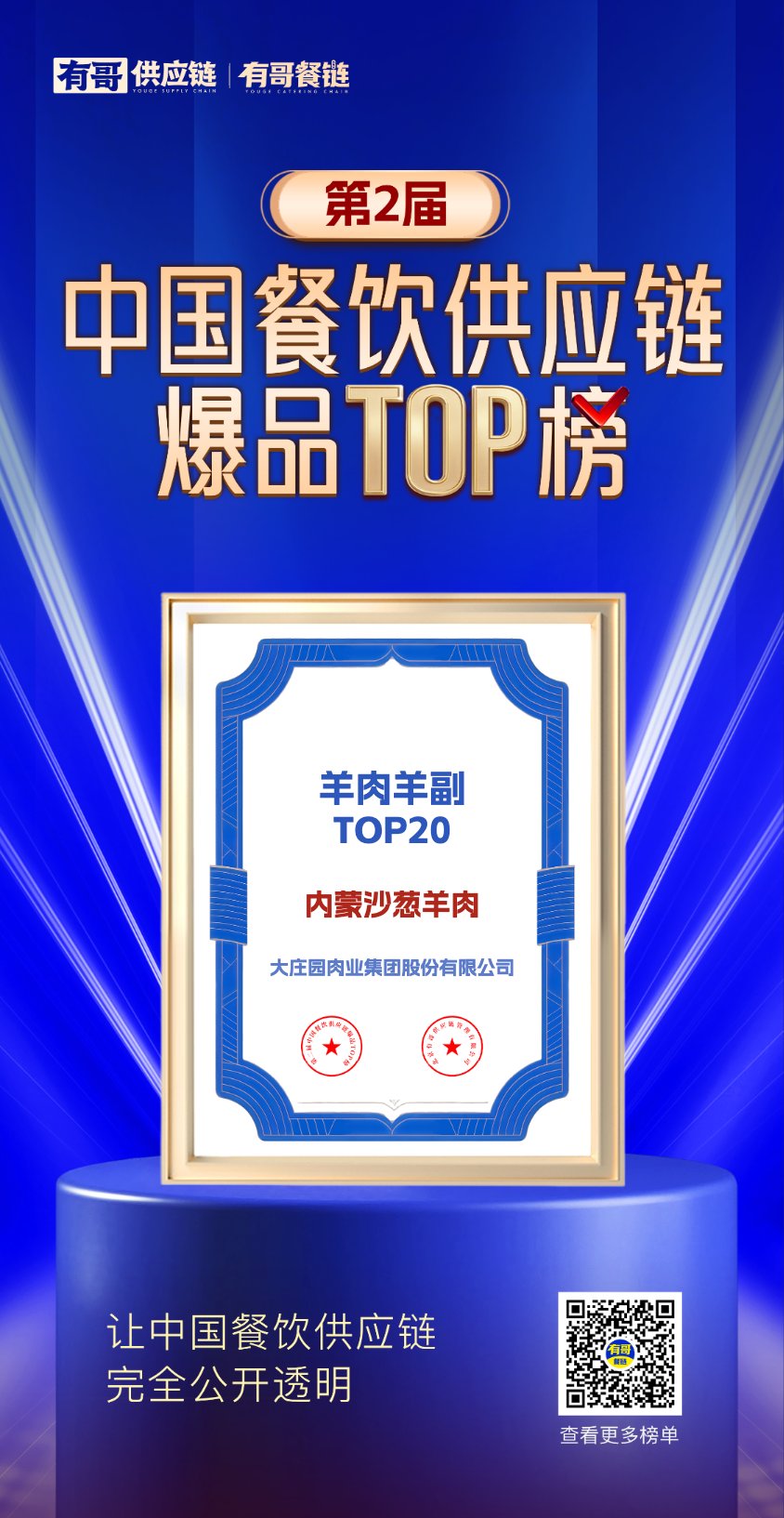 2025年10月22日,由有哥供應鏈主辦的“第二屆中國餐飲供應鏈爆品TOP榜”正式揭曉。大莊園集團旗下產品“內蒙沙蔥羊肉”憑借卓越品質與市場表現,榮登羊肉羊副品類TOP20榜單。